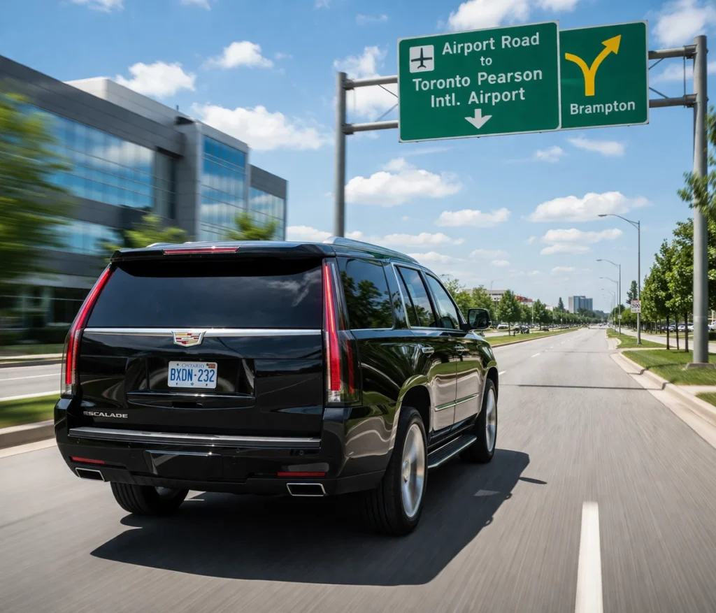 Downtown Brampton (L6V/L6W)—including Queen Street East, Main Street South, and the Rose Theatre district—accesses Airport Road via Kennedy Road South or Torbram Road or uses Highway 410 for the west-terminal approach. The Gore Road area (L6P) in far northeast Brampton uses Gore Road to Airport Road for direct southern Pearson access. Churchville and Highway 10 corridor clients in southwest Brampton use the 410 South or Highway 10 to 401 West routing. In every case, our chauffeurs know your neighborhood’s specific routing—not just the city name.